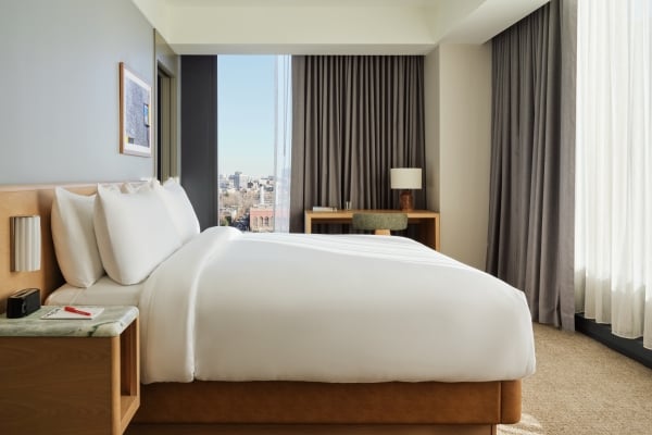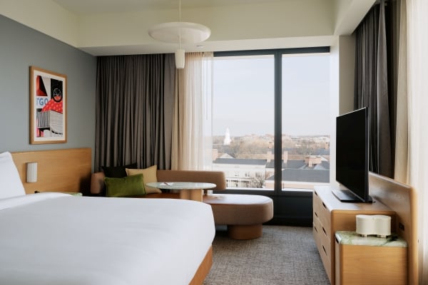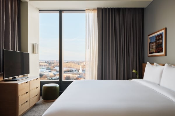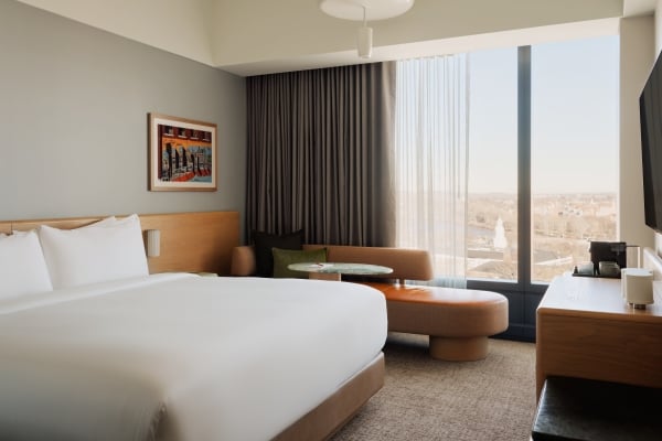 A bright, spacious corner room with expansive windows, signature design details, and a king bed made for restorative stays.
