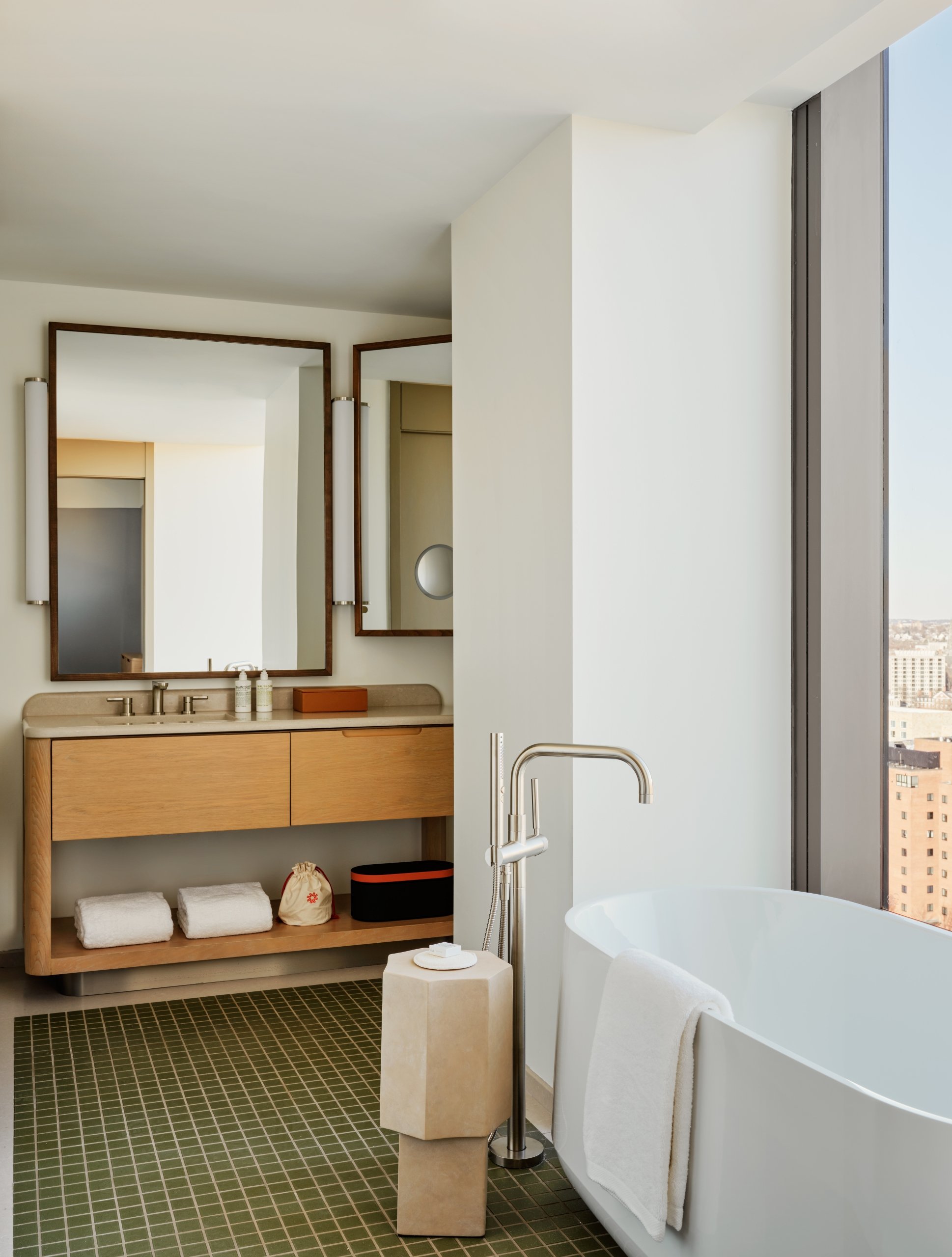 The Atlas Suite pairs penthouse-style grandeur with thoughtful modernity. Dual private entrances welcome you to a separate king bedroom, a dining area for six with butler pantry, and a living area with an L-shaped sofa and tailored armchairs. The spa-inspired bath includes a powder room, soaking tub, and walk-in shower. Polished details and modern finishes define an unmistakably signature suite experience, overlooking panoramic views of Boston.