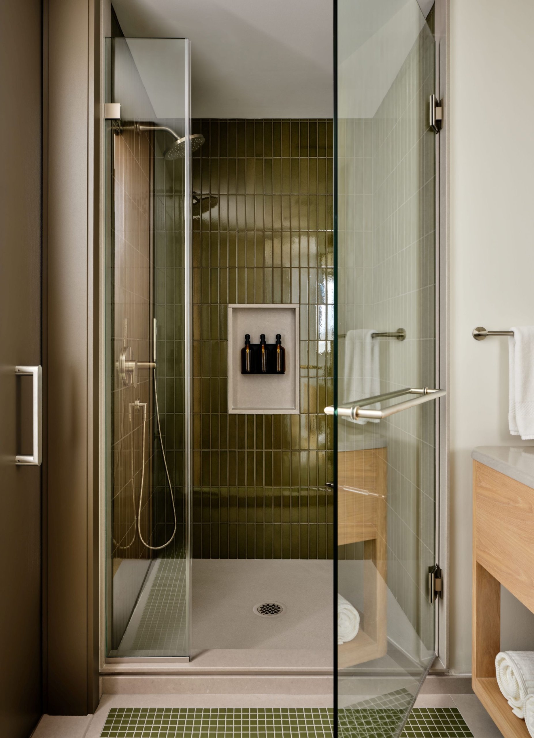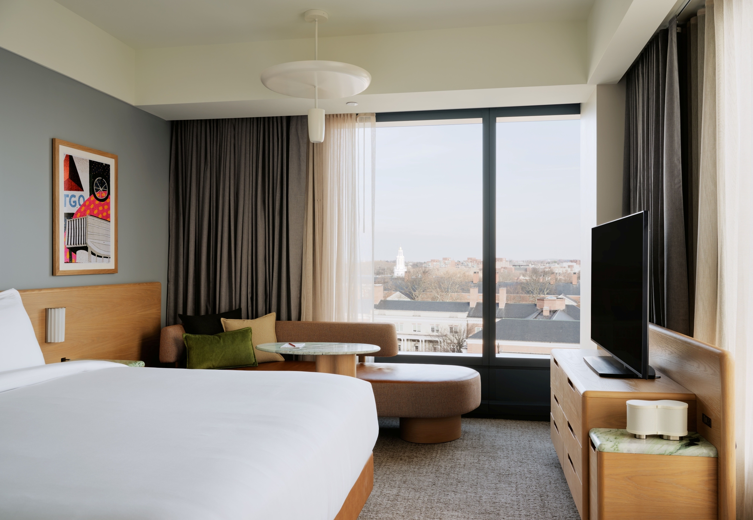 The sunlit and spacious King Corner Room offers enhanced natural light and wide views of Allston. Designed with organic curves and local art, the space features a plush king bed and large chaise with marble side tables, surrounded by warm wood credenza storage and leading to a modern bath and walk-in shower.