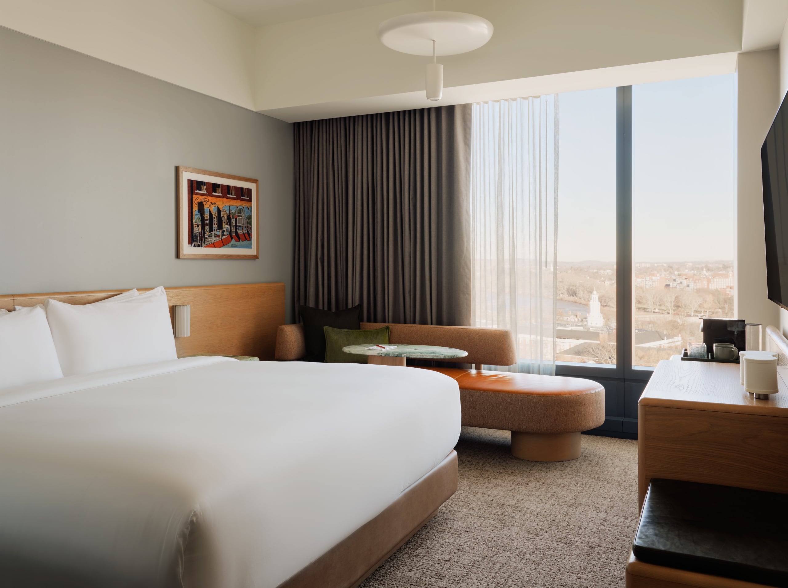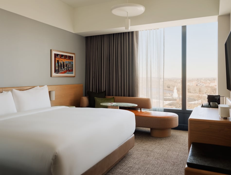 The King Hearing Impaired room features ample natural light surrounding a plush king bed and large chaise with marble side tables. Amenities for hearing assistance include a visual door knocker, text telephone with visual ring, and bed shaker alarm. Unique curved lines and art installations create residential touches, leading to a modern bath and walk-in shower.