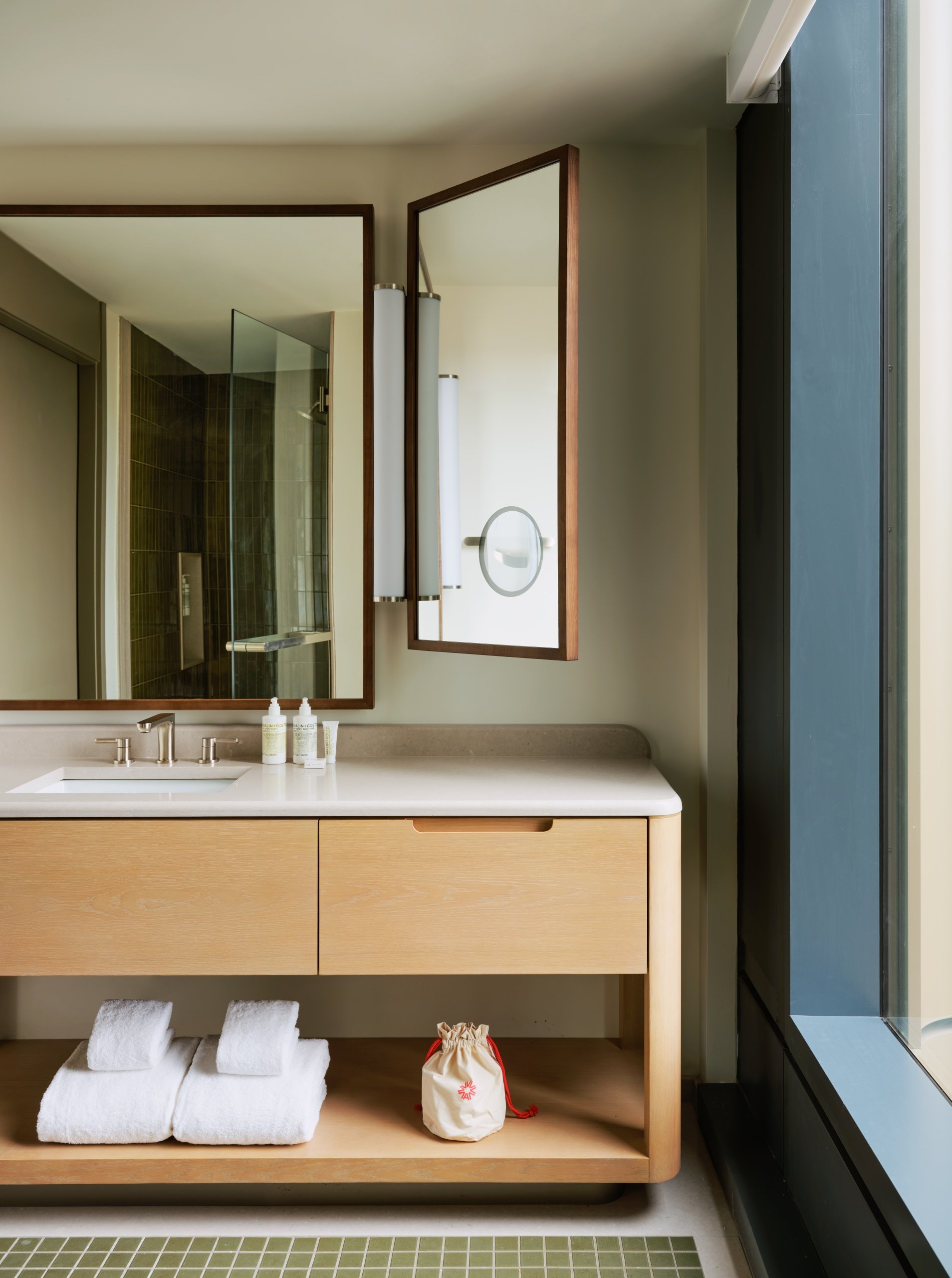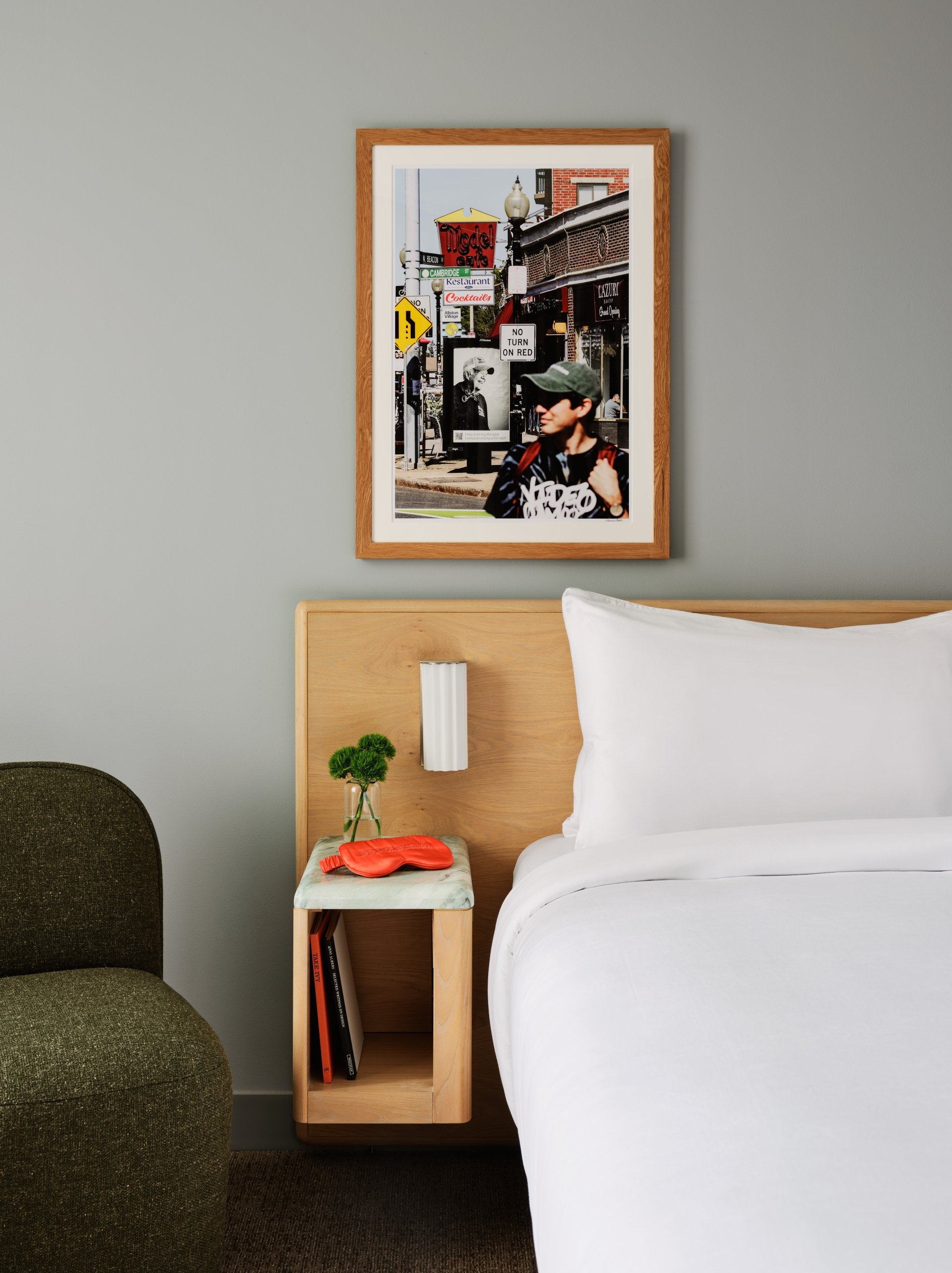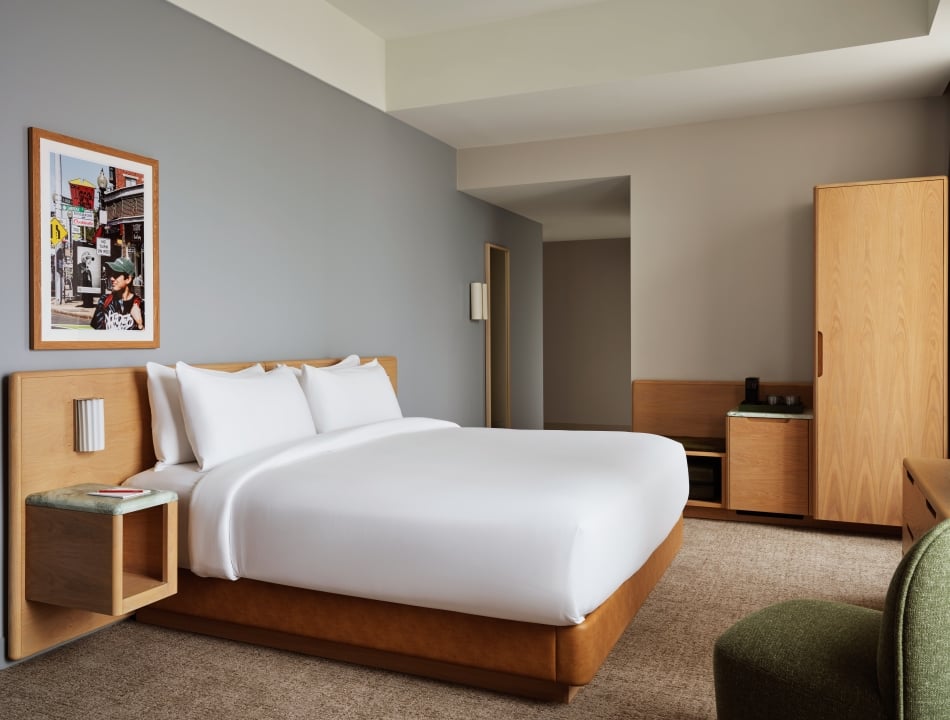 Spark inspiration with the oversized Premier King Room ADA Tub, bathed in natural light with corner views of Boston and surrounding academic life. The space offers accessible features with a plush king bed, large chaise, marble side tables and credenza storage with warm wood accents and local art leading into a spacious modern bath and accessible tub.