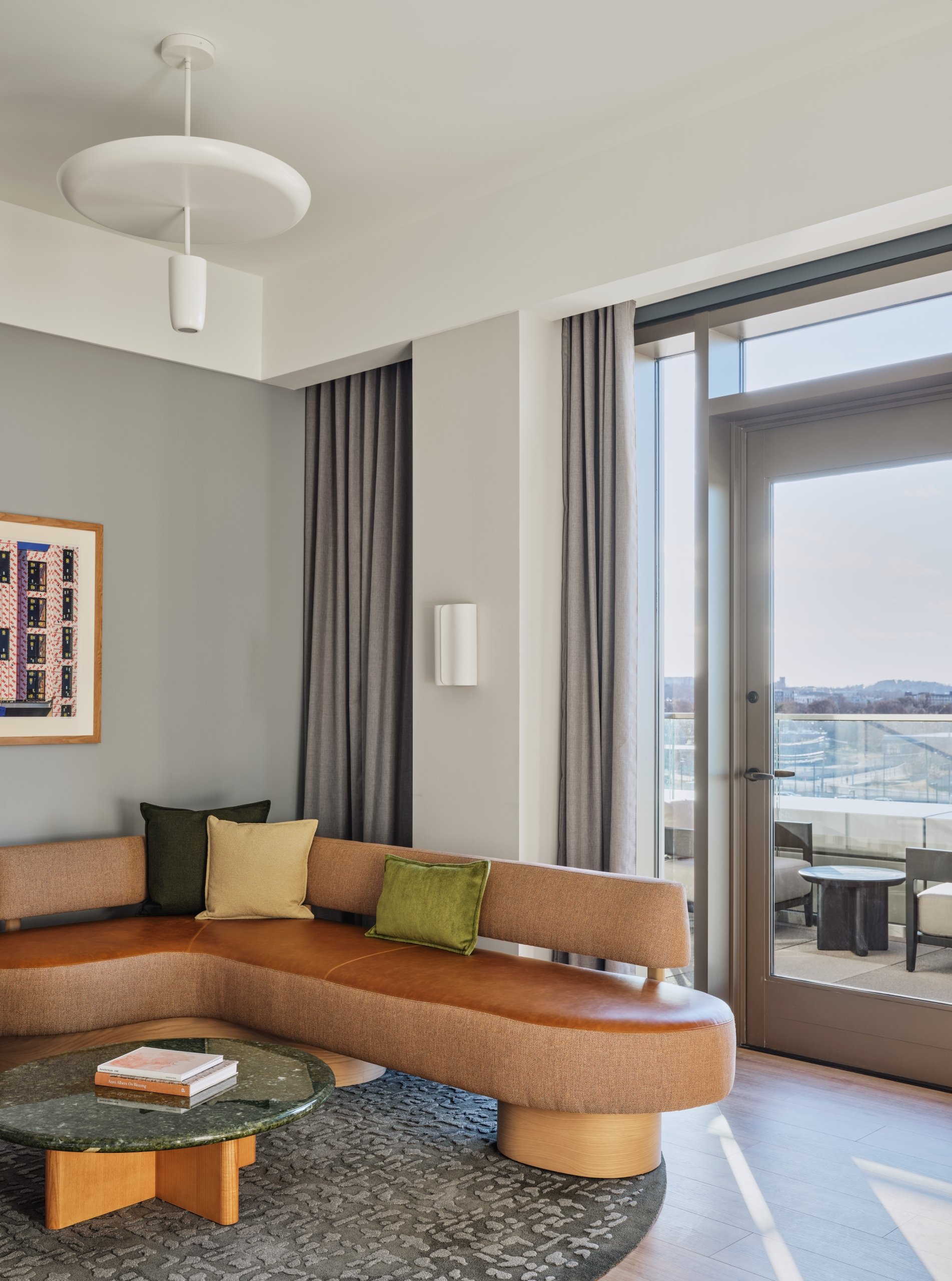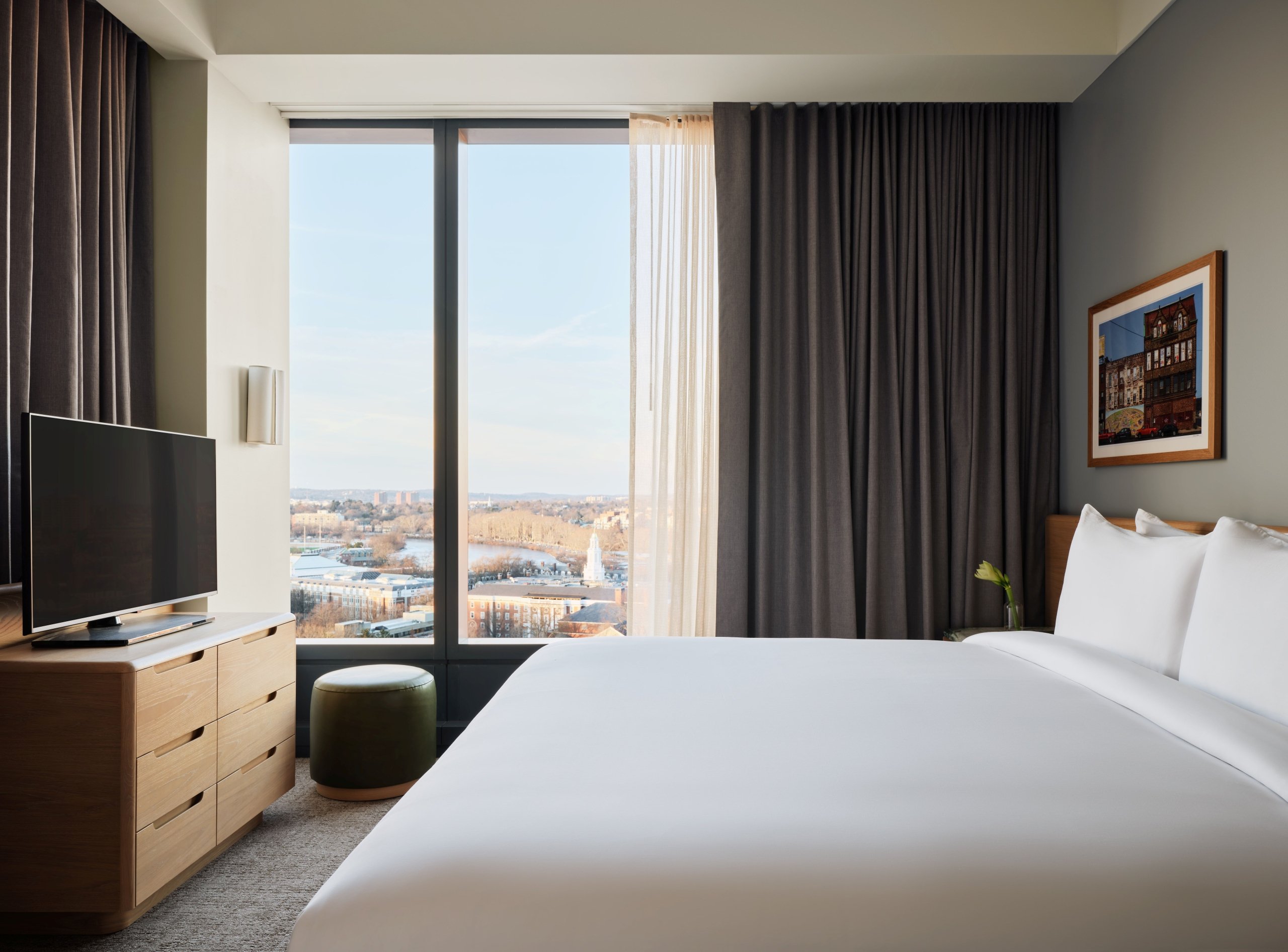 The Terrace Suite offers a modern suite design with a private outdoor terrace. The spacious interior features ample natural light and corner views, a separate king bedroom, modern bath with a wide vanity and walk-in shower, and a thoughtfully designed living area. Local artwork surrounds a stately L-shaped sofa, marble coffee table, and a separate dining table. Sliding doors open to an expansive private terrace offering sweeping views of Boston and Harvard Stadium.