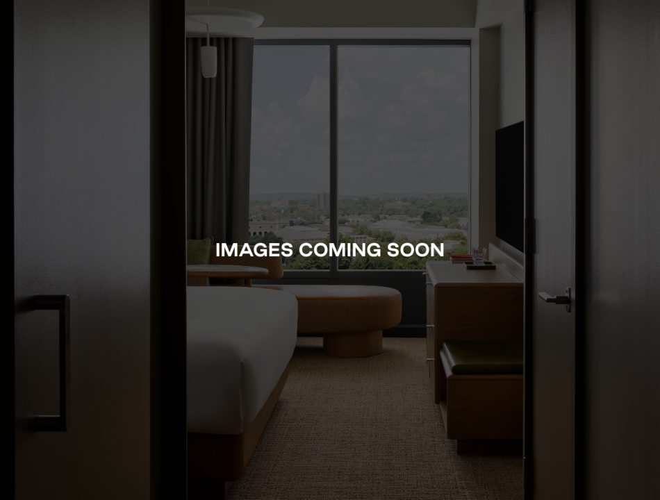 The Tower Suite offers elevated comfort and ample space with sprawling views of Allston, featuring a separate king bedroom with generous storage accented in warm wood and stone. The living space features local art over a stately L-shaped sofa and marble coffee table, connecting into the dining area and kitchenette. The modern bath includes a powder room and walk-in shower.